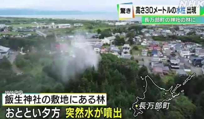 据北海道当地媒体报道,8月8日傍晚,在北海道大岛县奥沙姆贝(Oshamambe)镇一座神社旁的森林中,一股水柱突然喷涌而出。水柱一开始很弱,约2小时后加速喷出,在22日甚至喷出30多米的高度。