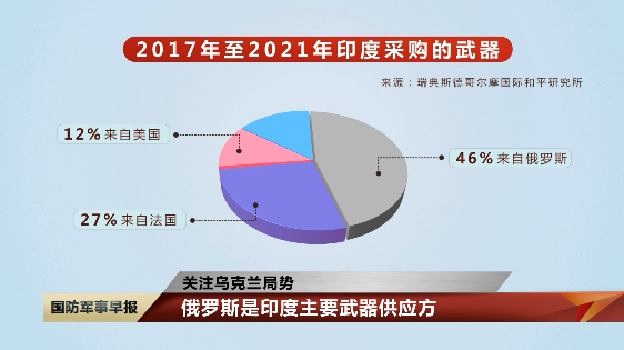 据瑞典斯德哥尔摩国际和平研究所发布的数据显示,2017年至2021年间,印度采购的武器中12%来自美国、27%来自法国、46%来自俄罗斯。17号,《日本经济新闻》报道,印度正为改变在军事方面过度依赖俄罗斯的状况开始“布局”,以谋求逐渐“脱离俄罗斯”。