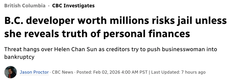 孙婵的公司曾重金押注被称为温哥华地产「黄金走廊」的 Cambie Corridor 区域。然而,随着市场下行,Landmark 旗下的两处 Cambie 街物业已进入破产管理程序。债权人已针对孙个人及其公司获得了总计超过 $1.15 亿加元的判决。