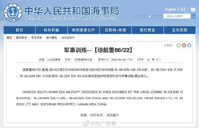 5月26日,三亚海事局发布航行警告,5月28日8时至13时,南海部分海域进行军事训练,禁止驶入。
