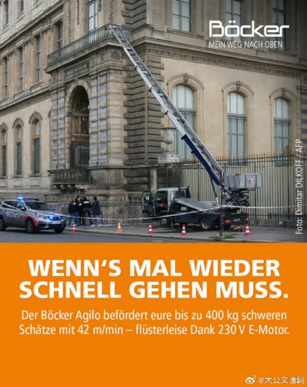 德国升降梯制造商“Boecker”发现,自家产品出现在巴黎卢浮宫珠宝劫案中,劫匪乘坐该公司制造的升降梯从博物馆窗户潜入。