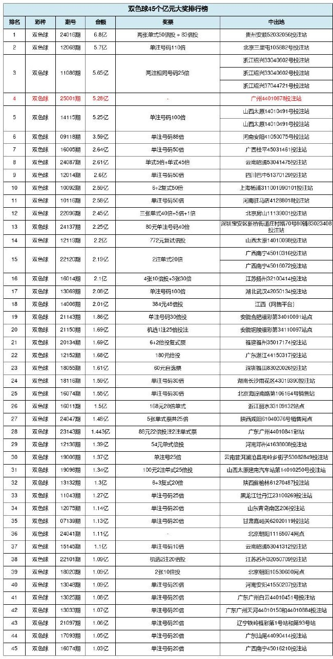 本次5.28亿巨奖,是福彩双色球游戏开出的第45个亿元奖,也是2025年双色球第1个亿元大奖,距离2024年11月28日晚深圳双色球2.25亿巨奖相隔35天。截止目前,本次5.28亿巨奖排名国内彩市亿元第4,也恰巧排名双色球亿元奖第4位,同时这也是国内彩市开出的第79个亿元奖!