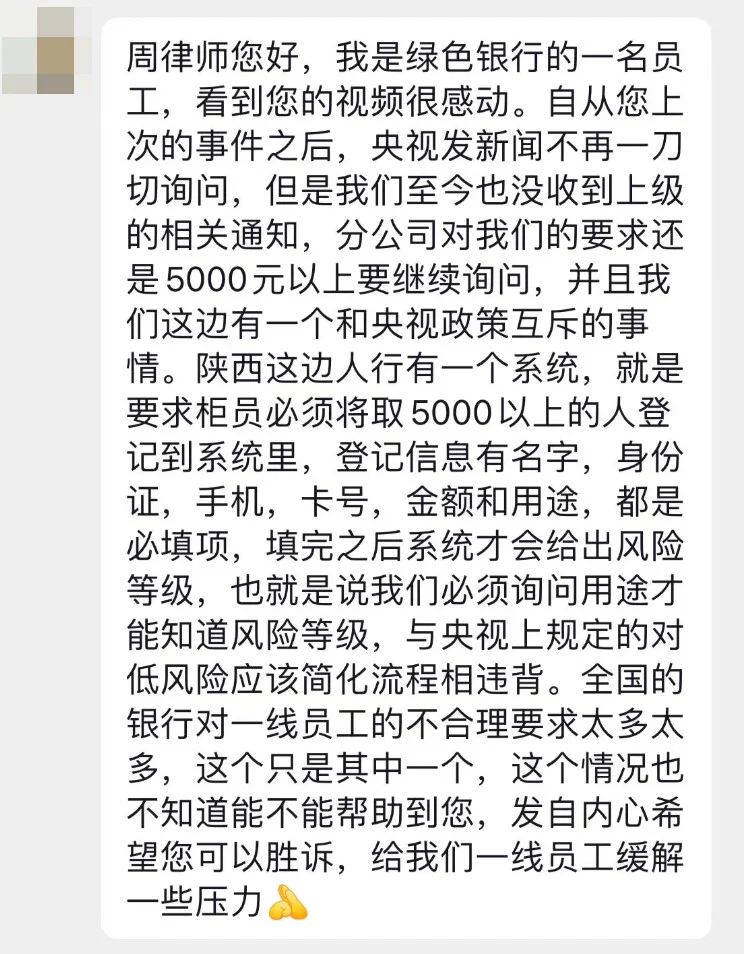 在周筱赟提供的未注明时间的截图中,一名自称是“绿色银行员工”的网友表示,在去年11月央视发文介绍银行取钱“不再一刀切式询问”的新规后,他没有收到上级的相关通知,分公司对其的要求仍是取款5000元以上就需要询问。