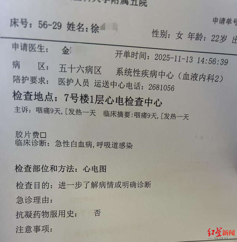 “现在在等杭州医院的基因检测,结果出来后医生才做化疗方案,身体稍微平稳后可以去做骨髓移植。但是,前期预估费用四五十万。”小徐告诉红星新闻记者,她的家庭已无力承担医疗费用,父亲因肝硬化丧失劳动能力,母亲患病难就业,弟弟尚在读初中。