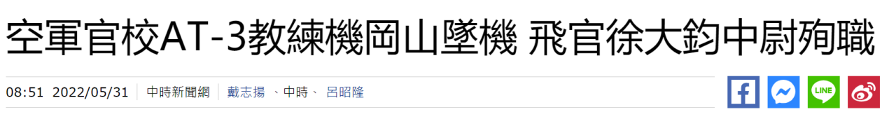 [环球网报道]台湾中时新闻网31日消息,台空军官校今天上午传出教练机训练意外消息。高雄空军官校高级组一架AT-3教练机,上午8时3分起飞进行训练飞行时,突然在雷达上光点消失,飞行员徐大钧失联,但高雄消防局获报,田厝一路77号附近发生坠机意外,经与空军官校人员赶赴现场,当时现场机身还有浓烟,并发现一具男性遗体,确定为徐大钧。