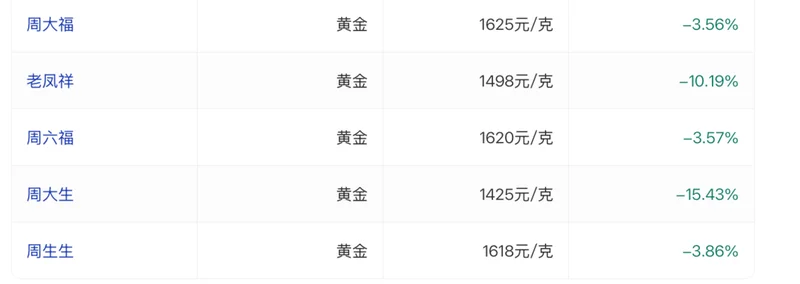 周大福从29日1706元/克跌至31日1625元/克,两天跌去81元;周生生从1708元/克降至1618元/克,跌去90元;老庙黄金从1706元/克跌至1546元/克,两天缩水160元;老凤祥更甚,从1713元/克跌至1498元/克,蒸发215元。