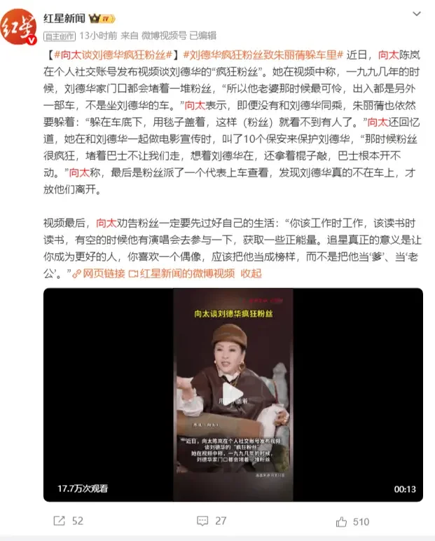 近日,向太陈岚在社交媒体分享视频,谈及刘德华早年遇到的“疯狂粉丝”现象。她回忆上世纪90年代,刘德华家门口常被粉丝围堵,导致其太太朱丽蒨出行极为不便。