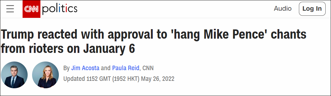 (观察者网讯)据CNN、NBC等多家美媒当地时间5月26日报道,美国众议院负责调查2021年1月6日国会骚乱事件的特别委员会近日收到证词,称暴徒在骚乱期间喊出了“绞死迈克·彭斯(hang Mike Pence)”的口号,而特朗普对此表示支持。