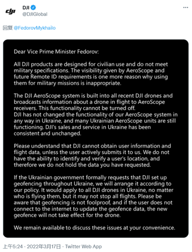 大疆在几个小时后在公开信下回复,大疆的产品不适用于军事用途,而且大疆并不掌握用户的数据,无法提供。与此同时,大疆提出如果乌克兰政府有明确政策,可以在乌克兰全境设立地理围栏。但这需要无人机联网更新地理围栏数据才会生效。如果已经激活的无人机始终不联网运行,增设的地理围栏不会生效。大疆方面表示,愿意随时公开讨论这个问题,但并未收到进一步回复。