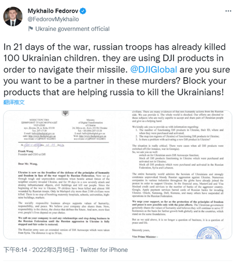 原来,在3月16日,乌克兰政府副总理兼数字化转型部部长米哈伊洛·费多罗夫在社交媒体推特上发出致大疆的公开信,声称“俄罗斯使用大疆产品来为导弹提供导航”,要求大疆停止与俄罗斯往来,向乌克兰提供所有在乌克兰运行的大疆无人机的数据并关闭除乌克兰用户以外的无人机。
