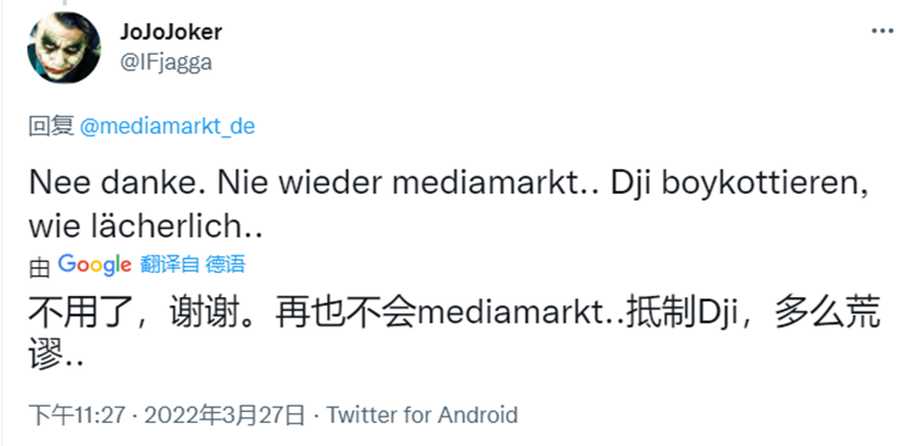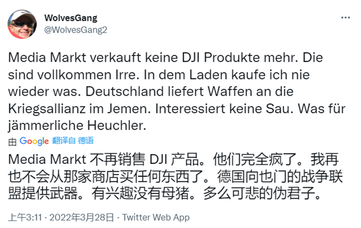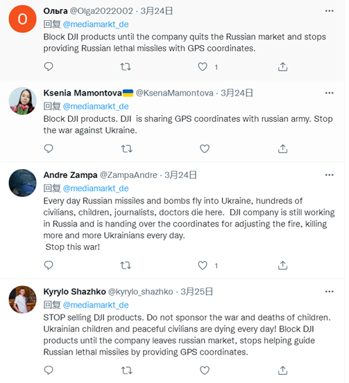 上周,大疆及全球合作伙伴的社交媒体账号均遭受了协同一致的水军刷屏攻击,诽谤大疆在国际局势中有不当行为,给多方的社交媒体运营带来了困扰。德国MediaMarktSaturn零售集团是大疆多年的合作伙伴,也是这起网络暴力事件的受害者之一,上周五他们考虑安全原因暂停了电商与门店的大疆无人机销售,关于这一事件双方仍在沟通和讨论中。