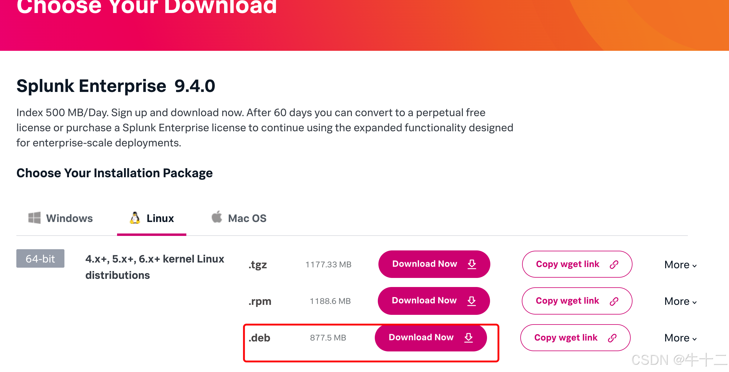 链接地址是:wget -O splunk-9.4.0-6b4ebe426ca6-linux-amd64.deb "https://download.splunk.com/products/splunk/releases/9.4.0/linux/splunk-9.4.0-6b4ebe426ca6-linux-amd64.deb"