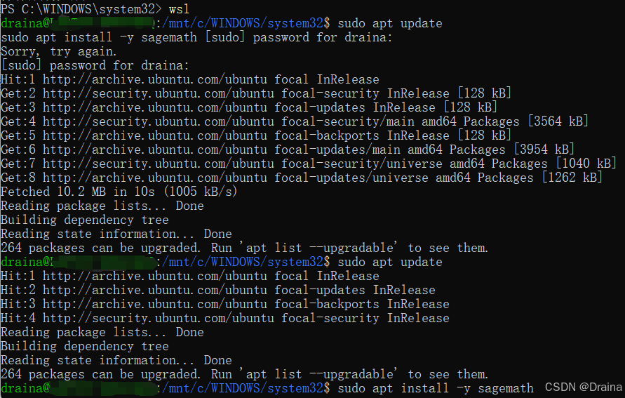 我们打开管理员的powershell,输入wsl进入ubuntu,更新apt,安装sagemath。
