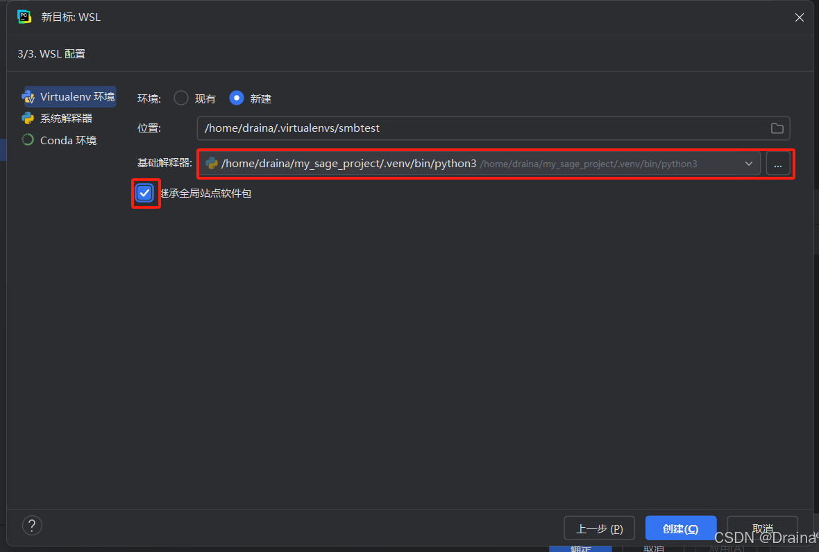 位置可以默认,下方基础解释器参考我的路径找一下,如果你上面的操作和我一致,路径应该只有用户名不一样,很好找,勾选上下方的框框,点击创建即可。
