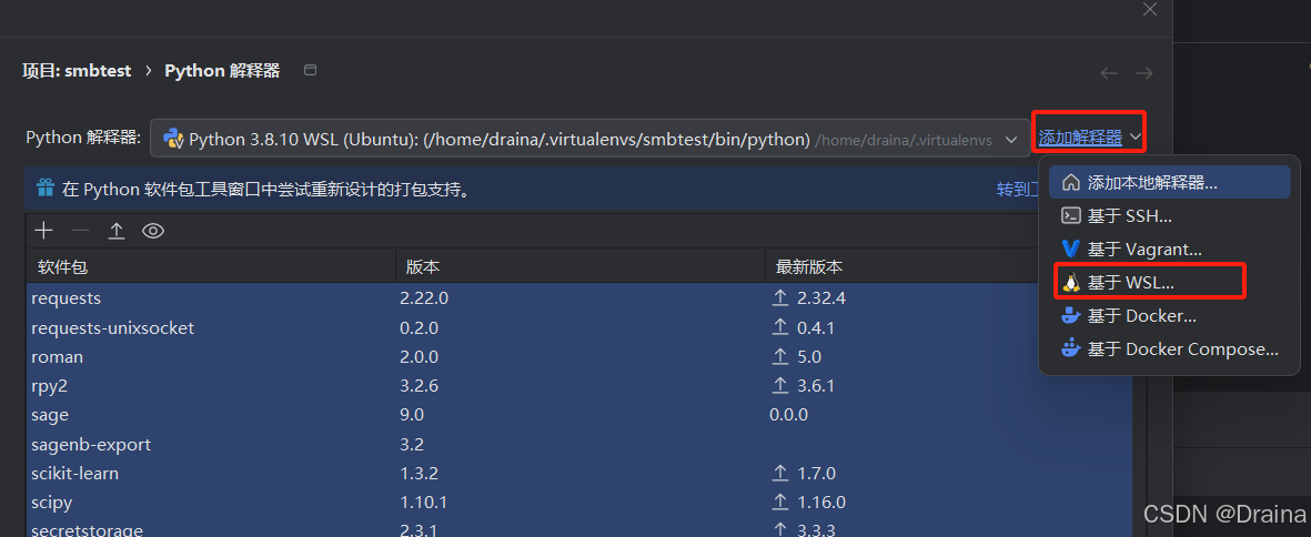 我们打开解释器设置,点击右边的添加解释器,下拉框有“wsl”(只有pycharm pro有)
