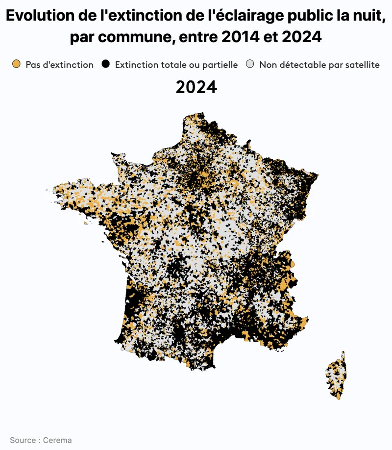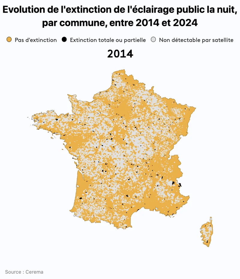 根据法国公共机构Cerema去年夏天发布的一项调查,研究人员通过卫星图像,对2014年至2024年间法国夜间照明情况进行了系统分析。