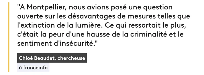 在蒙彼利埃的一项调查中,研究人员曾让居民自由填写“夜间熄灯的弊端”。出现频率最高的回答,并不是具体犯罪案例,而是对犯罪可能增加的担忧,以及夜间出行的不适感。