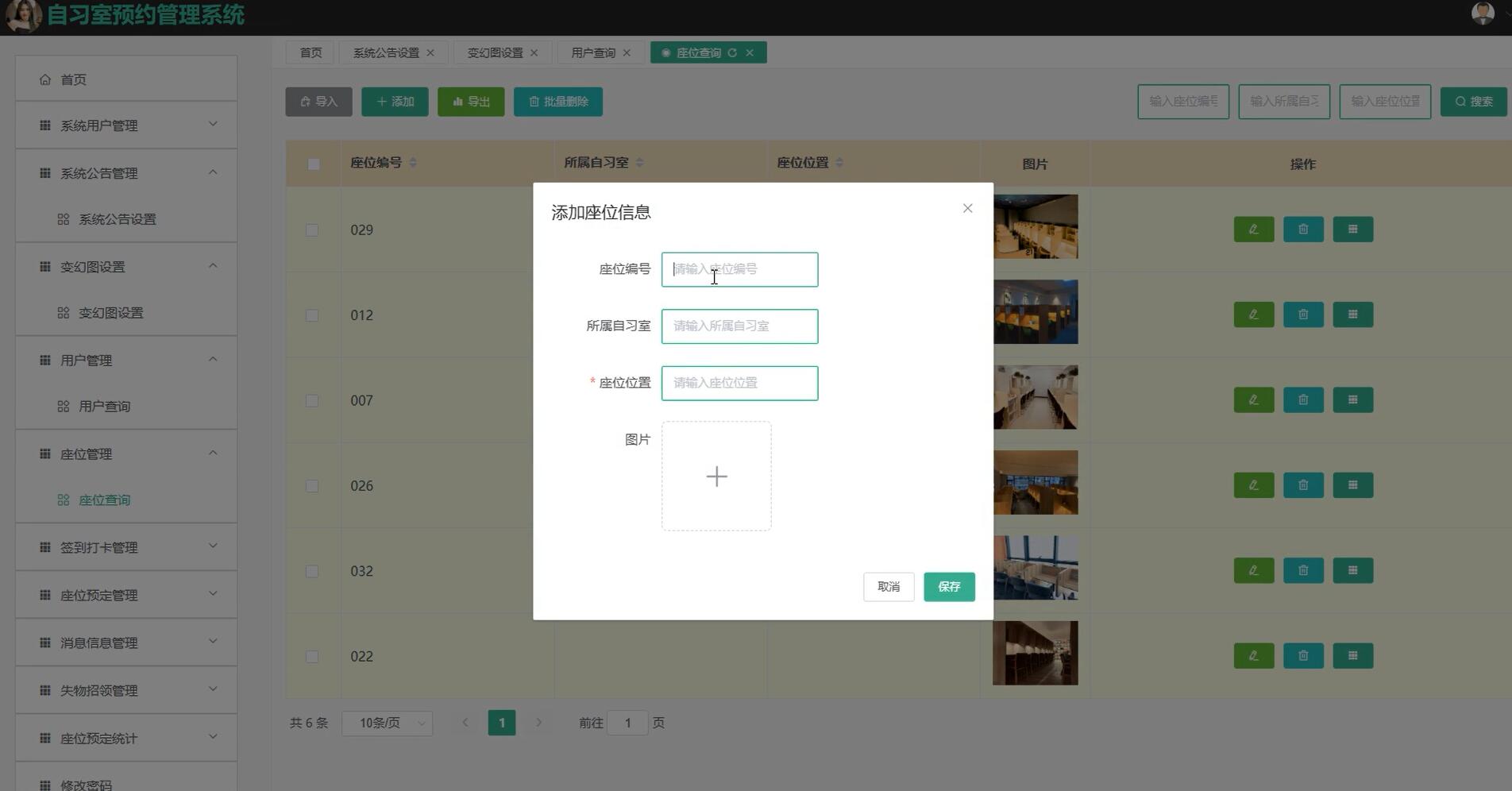 座位管理模块:实现座位信息的录入、编辑、删除和查询功能。管理员可以通过该模块管理自习室座位的基本信息,并实时更新座位状态。