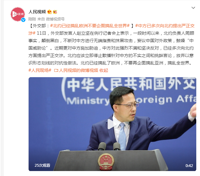11日,外交部发言人赵立坚在例行记者会上表示,一段时间以来,北约负责人罔顾事实,颠倒黑白,不断对中方进行无端指责和抹黑攻击,妄议中国对外政策,鼓噪“中国威胁论”。近期更对中方施加胁迫,中方对此强烈不满和坚决反对,已经多次向北约方面提出严正交涉。北约应该立即停止散播针对中方的不实之词和挑衅言论,放弃以意识形态划线的对抗性做法。北约已经搞乱了欧洲,不要再企图搞乱亚洲,搞乱全世界。