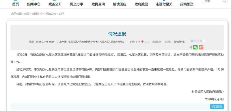 1日下午3时36分,七星关区人民政府新闻办发布情况通报:1月30日,有群众反映“七星关区三江城市花园A栋临街门面被连夜砌砖封堵”。接报后,七星关区住建、消防及市西街道、派出所等部门迅速赶赴现场开展核实处置工作。