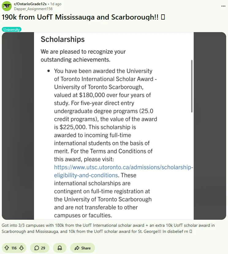 当然,评论还有高手:“恭喜你!我也拿到了国际学者奖学金,UTSG校区给了$10万!”