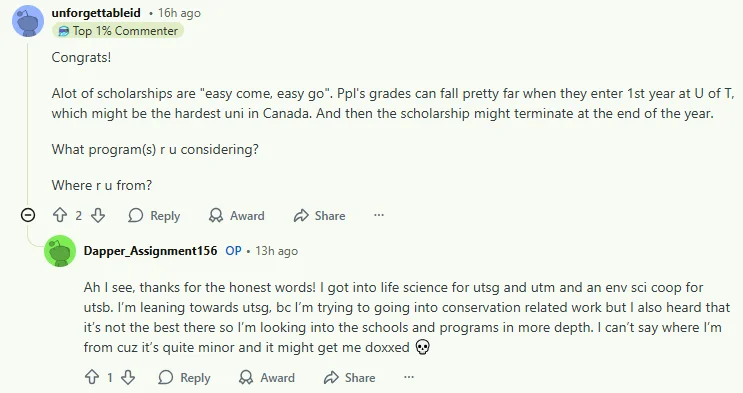 但是,帖主并不想暴露自己的国籍:“啊,明白了,谢谢你这么实在地说!我拿到了UTSG和UTM的生命科学录取,还有UTSC的环境科学Co‑op。我目前更偏向UTSG,因为我想走自然保护相关的方向,但也听说那边在这方面不算特别强,所以我现在正在更深入地研究各个学校和专业。至于我来自哪里就不说了,因为地方比较小众,怕被人‘开盒’(人肉)。”