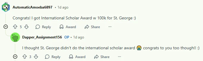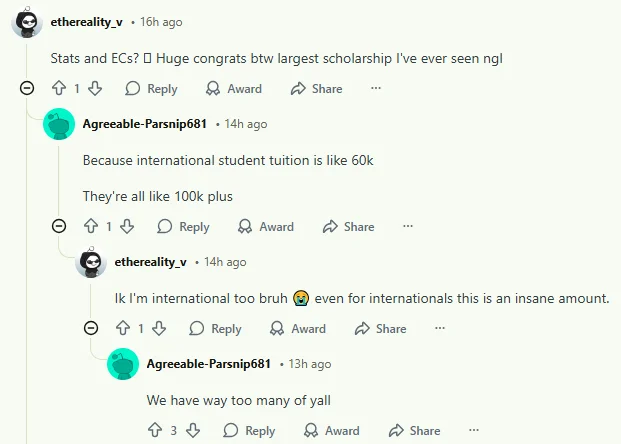 下面有人指出,国际生的学费本来就很高(6万左右一年),所以奖学金基本都是10万+。但这位好奇网友表示:“我知道,我也是国际学生😭 即使对国际学生来说,这笔钱也太多了。”