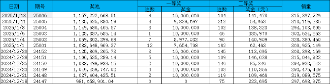 上一次大乐透奖池破11.5亿还是在2023年2月4日第23011期,但那也仅仅是昙花一现,此后9期由于多次开出头奖井喷,以至于奖池猛降到6.48亿,直到第23021期这一现象才得以缓解。此后奖池趋于稳定增长,期间也曾经历过多次起伏,直到2024年12月18日第24147期大乐透头奖空开,让奖池再度突回10亿大关。此后奖池继续稳步增长,在经历第25001期和第25002期两次头奖小井喷,奖池曾一度降至10.5亿,但最近4期大乐透有2次开出基本头奖,加之头奖注数偏少,如今奖池时隔709天重返11.5亿。