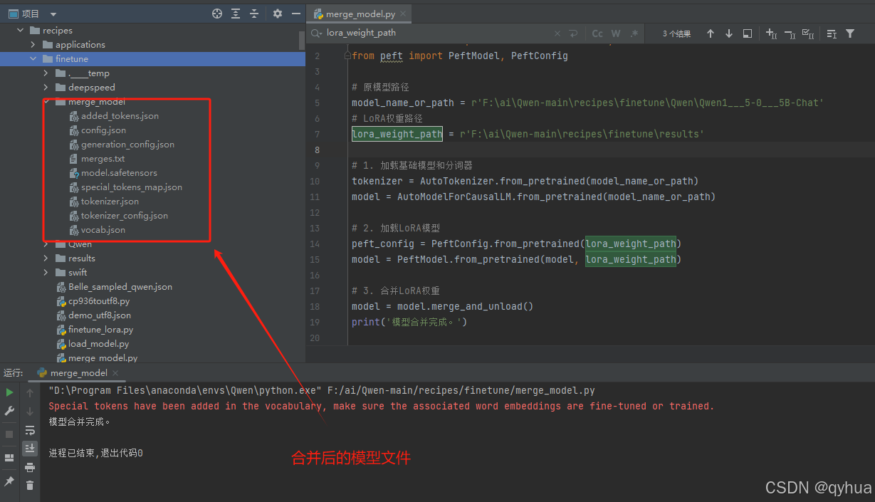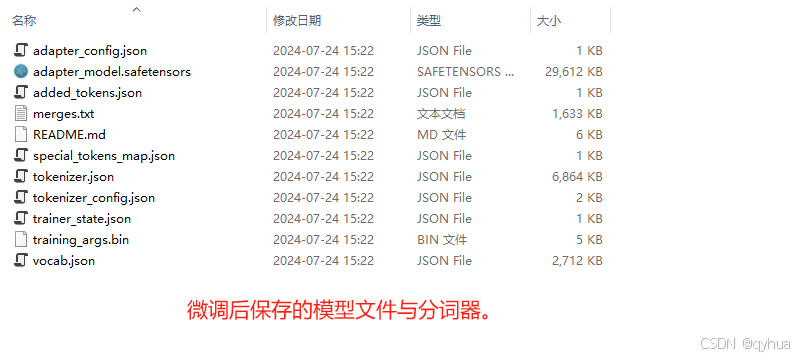 执行上面代码后会把基础模型+LoRA微调后的模型合并在一起并输出保存新的模型,这个过程不像微调,执行全并过程非常较快,合并后输出的模型文件如下图: