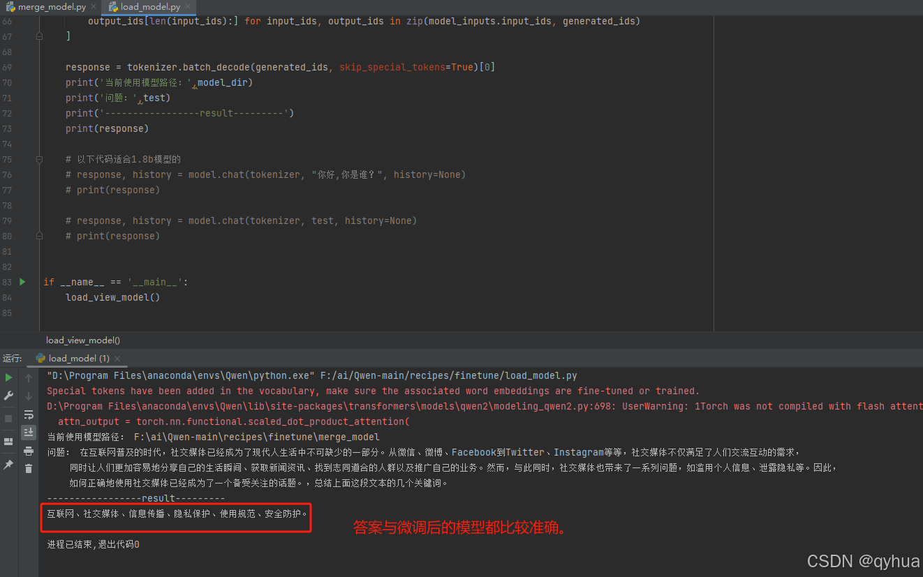 从上面对比图可以看出,微调后的回答的答案与模型合并的模型都差不多效果,比较准确。