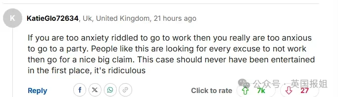 “如果你焦虑到无法上班,那你肯定也焦虑到无法参加聚会。像这样的人总是想方设法找借口不去上班,然后伺机索赔一大笔钱。这种案子一开始就不应该受理,简直荒谬至极。”