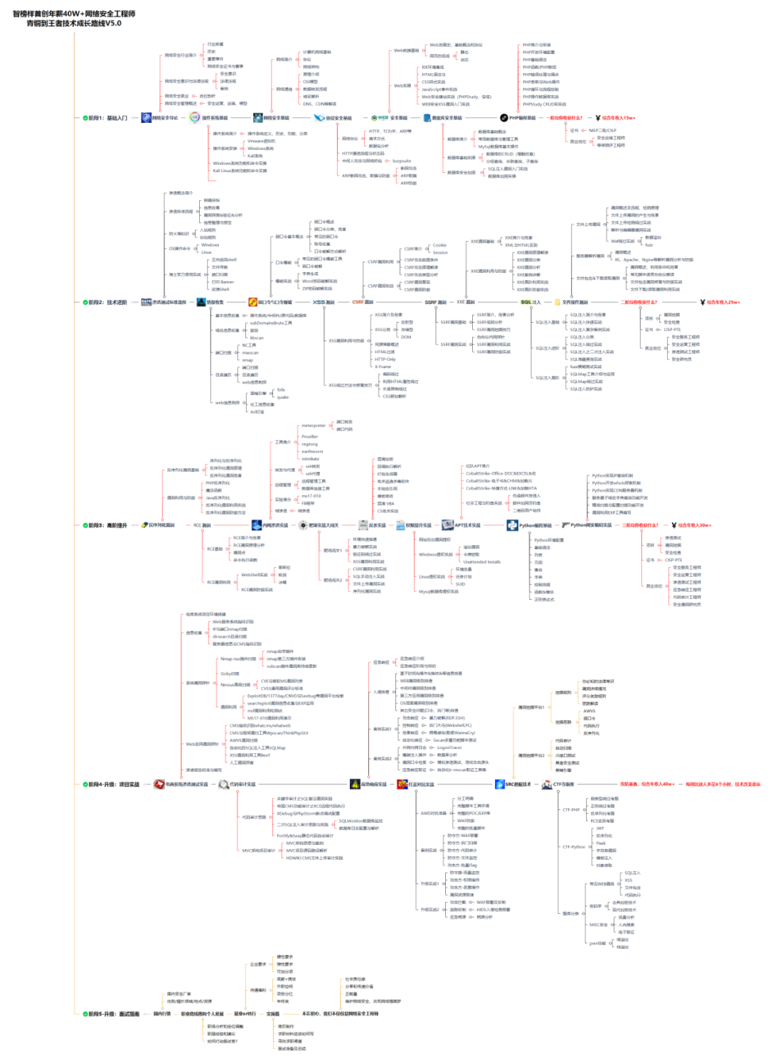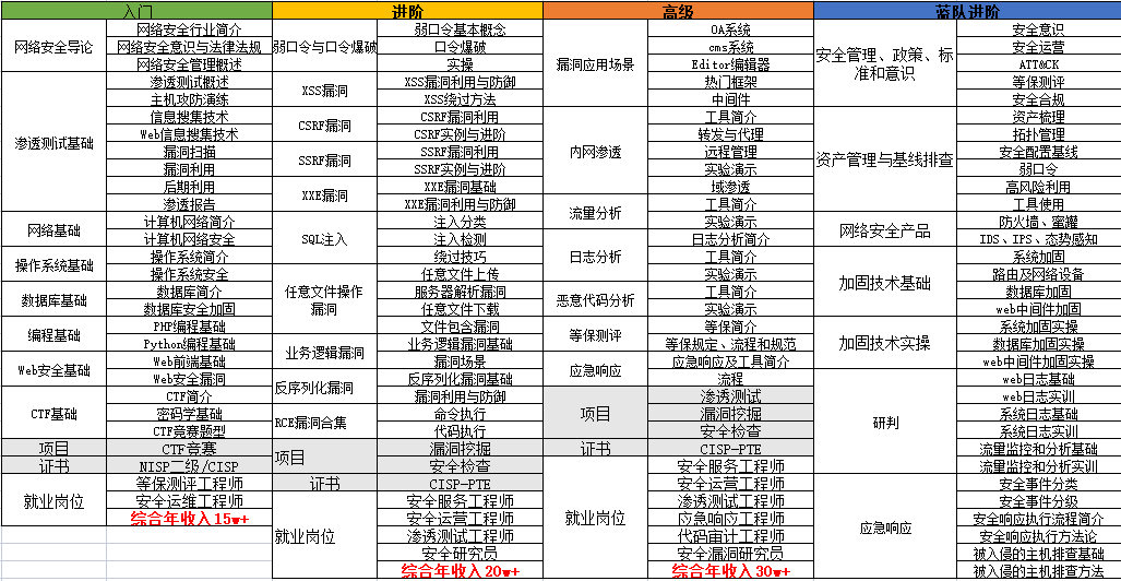 对于从来没有接触过网络安全的同学,我们帮你准备了详细的学习成长路线图&学习规划。可以说是最科学最系统的学习路线,大家跟着这个大的方向学习准没问题。