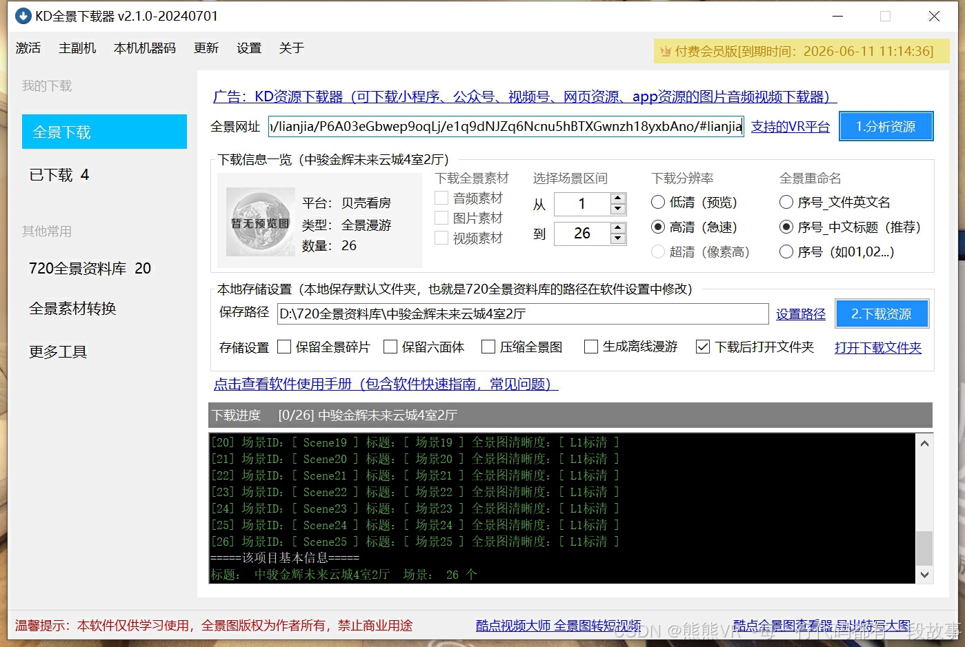 - 开始下载:点击下载资源按钮,KD全景下载器会开始下载素材到本地,并进行数据还原。下载时间取决于网速和数据大小。