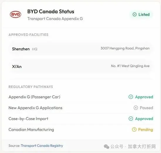 关于中国电动车进入加拿大市场的讨论,缺少一个关键事实:比亚迪(BYD)其实早已获得加拿大监管部门的批准,并出现在加拿大交通部的 Appendix G 注册表中。这意味着它不是在等待批准,也不是“申请中”,而是已经获准了!