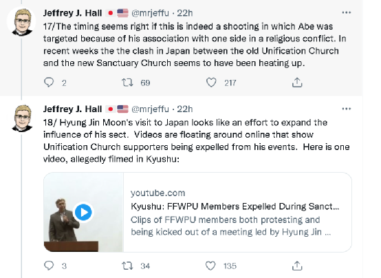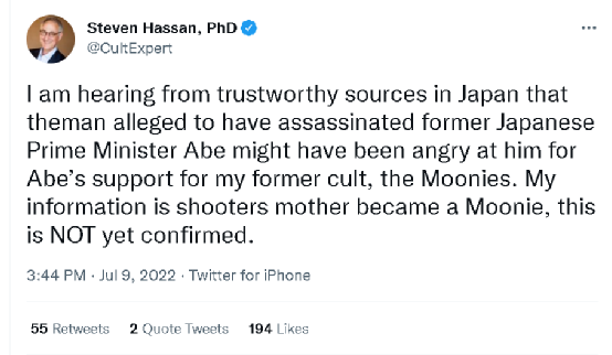 其中,常年研究该宗教团体,并曾多次在涉及该团体的事情上接受诸如英国《卫报》等西方主流媒体采访的美国知名邪教问题专家斯蒂文·哈桑 (Steven Hassan)就于7月9日发帖表示,他从“来自日本的可信信源”处听说,导致山上彻也的母亲破产,进而令他盯上安倍的,是在英语世界被称作“Moonies”的韩国统一教——尽管哈桑随后又表示这个消息尚未被官方确认。