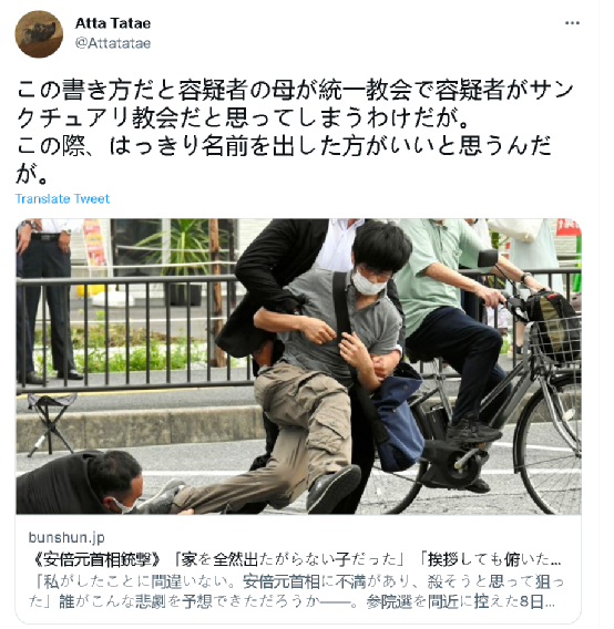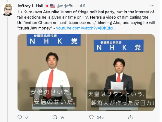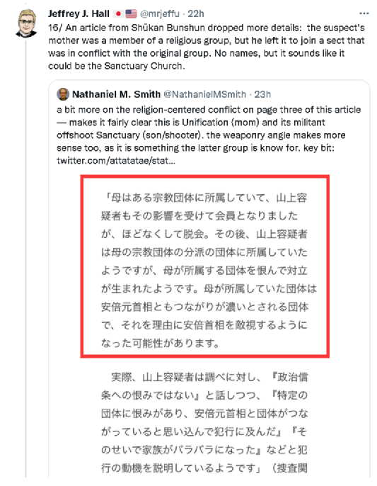 尽管《现代商务》和《FLASH》是目前仅有的几家宣称涉案宗教团体是“韩国统一教”的日本媒体,且这一说法尚无其他媒体的报道或是官方的信息佐证。但值得注意的是,在境外的社交网络推特上,也有不少日本人或是熟悉“韩国统一教”的网民怀疑导致山上彻也刺杀安倍的宗教团体就是这个与日本乃至美国等众多国家的右翼政治势力关系密切的韩国宗教团体。