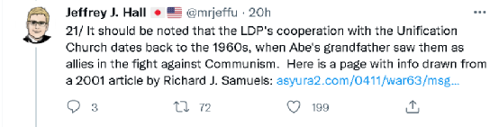 至于韩国统一教在日本的活动,从我们前面提到的那位日本神田外国语大学的美籍教师霍尔给出的资料来看,该团体确实也与安倍及其所代表的日本右翼政治势力有密切关系,而且与在美国的情况一下,该团体也会给日本保守的右翼势力——比如自民党(LDP)——提供支持。