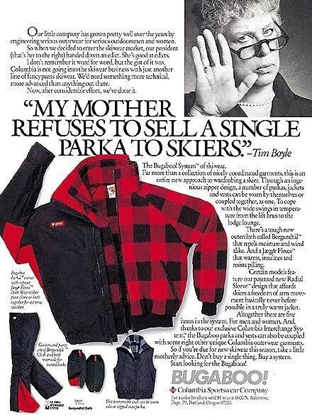1986 年, Columbia 的经典产品 Bugaboo Parka 三合一外套上市,首年销量破百万,累计卖出 700 万件,打了个漂亮的翻身仗。