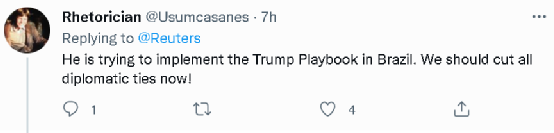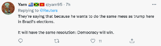而其他围观此事的外国网民还担心这可能预示着博索纳罗想在今年的巴西总统选举中效仿特朗普的做法,一旦败选可能也会拒绝承认,并指控对手“作弊”。