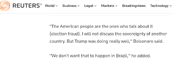 此前,根据路透社等众多外媒的报道,博索纳罗在2020年美国总统大选后,曾一度坚定地选择支持特朗普以及特朗普抛出的那些缺乏实证的“美国大选有欺诈”的说法,认为拜登是靠“作弊”上台的。路透社还称博索纳罗是全世界最后几个认可拜登是美国总统的国家领导人中的一个。