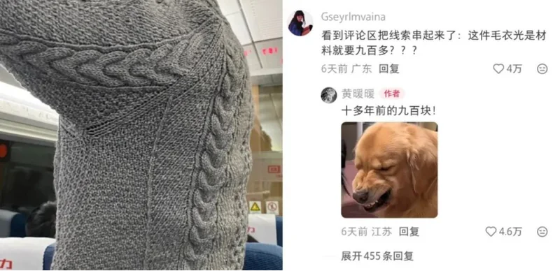 小红书网友@黄暖暖发帖称,在高铁上发现身边一位男乘客的毛衣花纹丰富、质感很好,询问是不是手工织的,与他同行的女乘客很开心地介绍这是十几年前自己织的,并为网友介绍了毛衣上自己设计的细节,透露毛线是十年前三百块一斤的高级羊毛线。