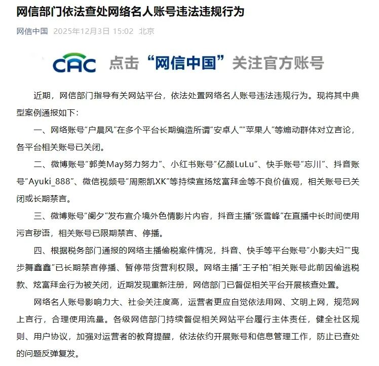 网信部门的通报早已释放明确信号:网络不是法外之地,流量从来不是免罪金牌。