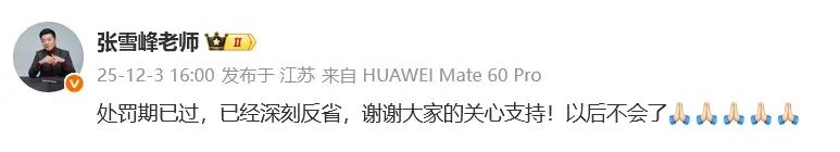 通报发酵后不久,张雪峰便在微博发文回应,一句“处罚期已过,已经深刻反省,谢谢大家的关心支持!以后不会了”,态度看似诚恳谦逊。