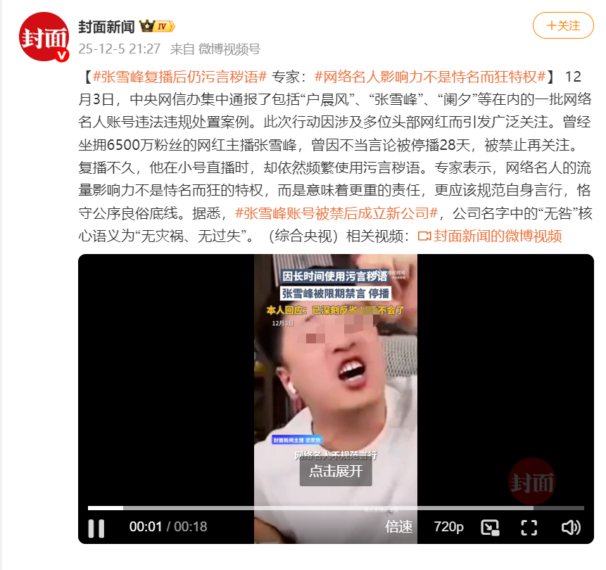 通报明确指出,张雪峰在直播中“长时间使用污言秽语”,严重违反网络文明规范,被平台采取“限期禁言、暂停直播”的处罚措施;