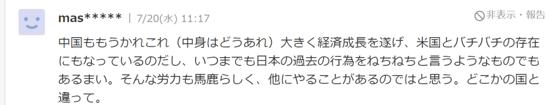 “中国经济发展成果这么显著,都能跟美国对着干了。也就别一直纠结日本当年的行为了吧。别浪费时间,做些正事去呗,别和某些国家一样。(这里应该指的是韩国)”