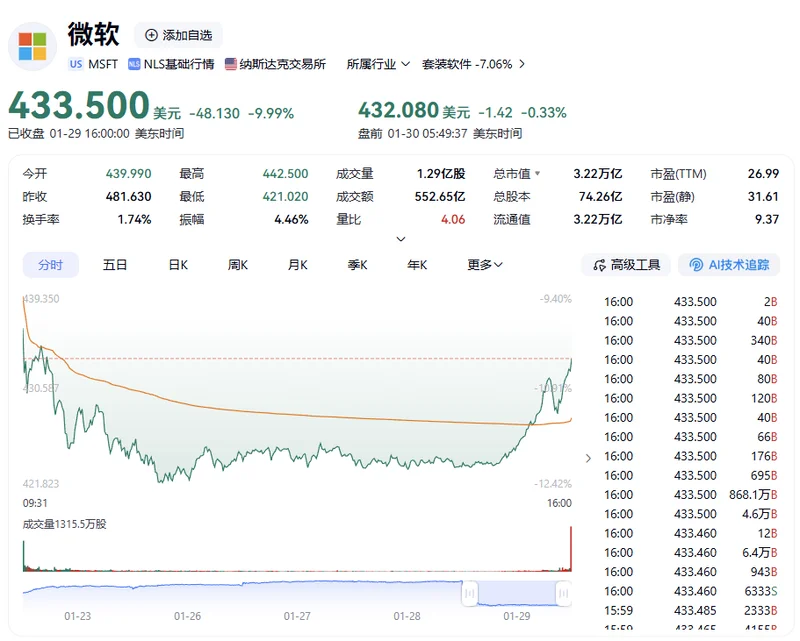 因为科技巨头的估值逻辑,是“高增长溢价”,只要增速还在飙升,市盈率再高都没人怕,可一旦增速放缓,哪怕只是轻微放缓,市场就会解读为,AI的红利见顶了,微软的增长神话走到了尽头。