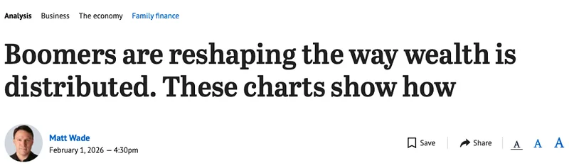 未来20年内,将有约3.5万亿澳元的财富从婴儿潮一代转移至后续世代。
