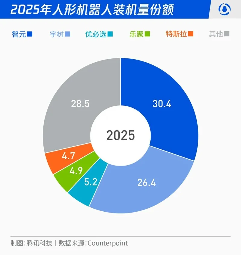 另外,市场机构Counterpoint日前披露的数据也显示,智元、宇树和优必选三家企业占据人形机器人市场份额前三名,分别为30.4%、26.4%、5.2%。
