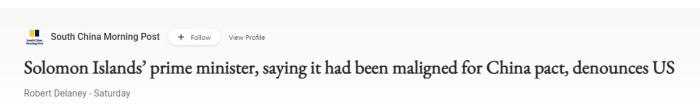 所罗门总理称因与中国签协议遭中伤,谴责美国。图片来源:香港《南华早报》报道截图