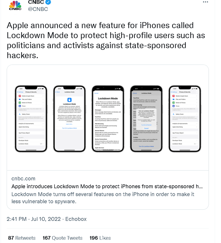 根据美国哥伦比亚广播公司网站(CNBC)7月10日的报道,苹果公司于上周三推出了一项可以让诸如政客和社会活动人士等高端用户封锁自己的手机和用户信息,从而可以减少他们的手机被有组织的黑客行为入侵的风险。